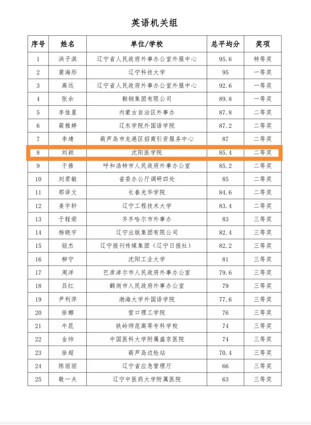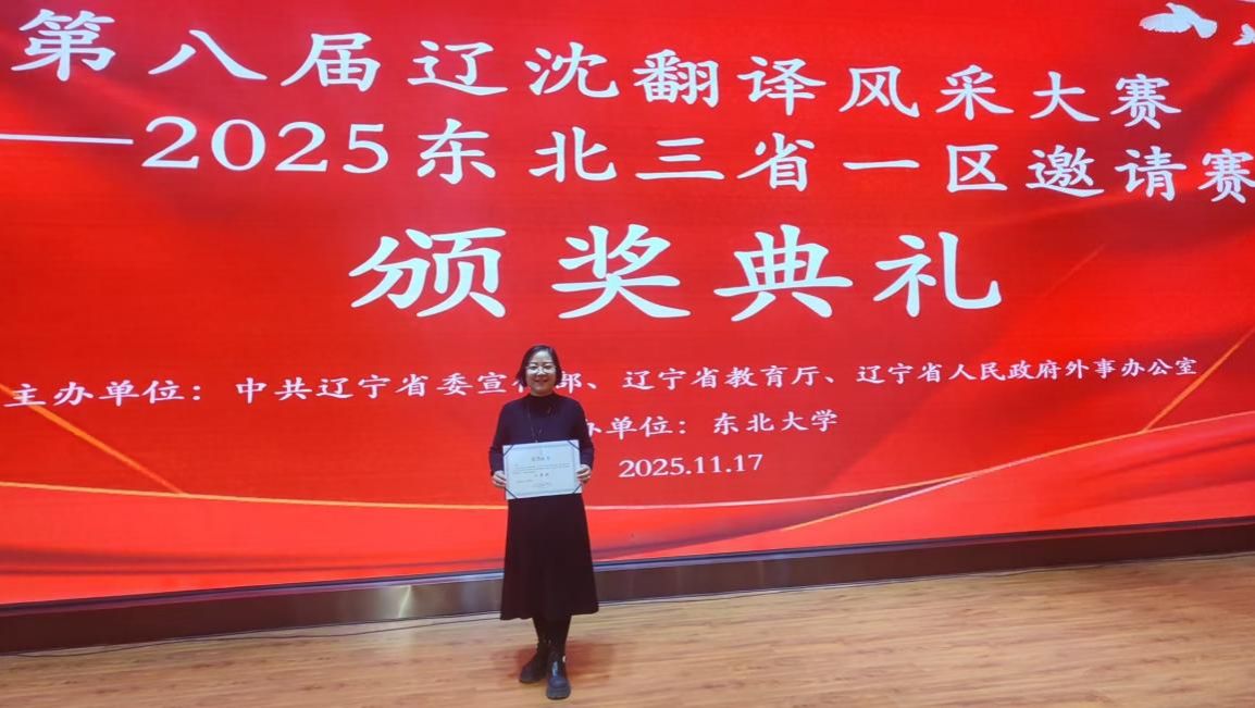 近日,由中共辽宁省委宣传部、辽宁省人民政府外事办公室、辽宁省教育厅联合举办的第八届辽沈翻译风采大赛——2025东北三省一区邀请赛在东北大学圆满落幕。本次大赛吸引了来自辽宁、吉林、黑龙江、内蒙古四地党政机关、高校及企事业单位的翻译精英同台竞技,各组别、各语种参赛总人数达479人,经过激烈角逐,最终143名选手成功晋级决赛。我校公共外国语学院刘颖老师凭借扎实的专业功底、深厚的知识储备和出色的临场发挥,在强手如林的竞争中脱颖而出。她在主题演讲、视频摘要和交替传译三个环节中,充分展现了其扎实的语言基本功、敏捷的思维应变能力、深厚的跨文化交际素养和过硬的专业实力,最终以总排名第8名的优异成绩,荣获机关英语组二等奖!其排名在沈阳地区所有高校参赛教师中高居榜首,获得了大赛评委的高度认可。