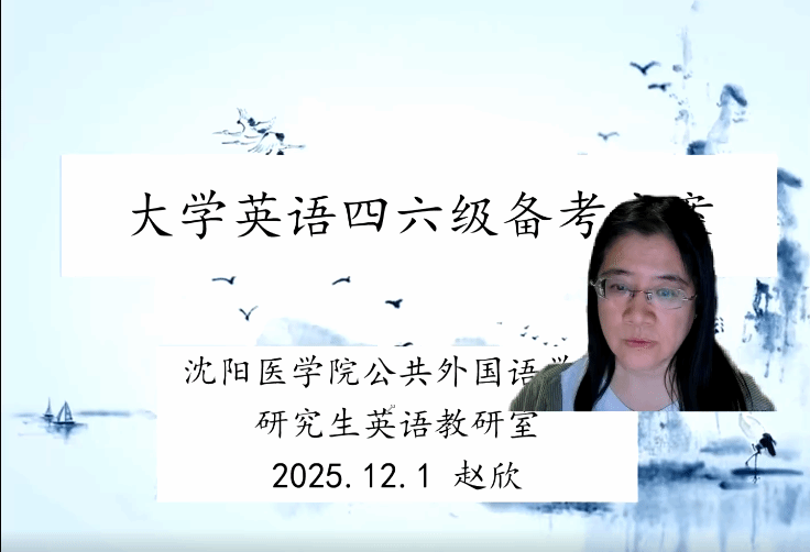 2025年12月1日晚19点30分,我院党总支部“党员先锋行,四六级助梦成”系列活动第九场在云端进行。腾讯会议直播间内人气爆满,公共外国语学院教师与沈医学子云端相聚,共探英语四六级备考秘籍。公共外国语学院研究生英语教研室赵欣老师通过线上平台,为医养学院和医学信息学院的同学们带来了一场主题为“四六级高效备考策略”的专题讲座。讲座聚焦考试核心题型与提分技巧,助力考生在倒计时冲刺阶段构建科学复习方案,精准突破备考难点。